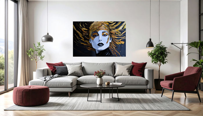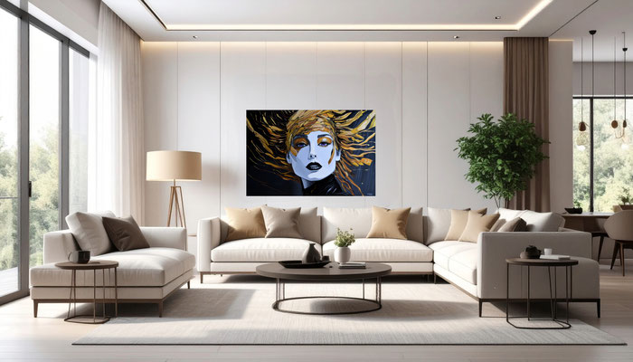 Farbenprächtiges Acrylgemälde auf Leinwand, das ein modernes, expressives Porträt einer Frau in leuchtenden Blau-, Orange- und Violetttönen zeigt. Dieses Unikat vereint Elemente der Pop-Art mit zeitgenössischer Malerei und zieht mit seiner dynamischen Komposition und intensiven Farbgebung sofort alle Blicke auf sich. Die Darstellung wirkt kraftvoll und emotional – perfekt als auffälliges Kunstwerk für moderne Wohnräume, Galerien oder Kunstsammlungen. Das mit Acrylfarben auf hochwertiger Leinwand gemalte Kunstwerk symbolisiert Stärke, Individualität und kreative Freiheit – ein beeindruckendes Beispiel moderner Kunst auf Leinwand.