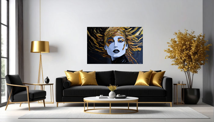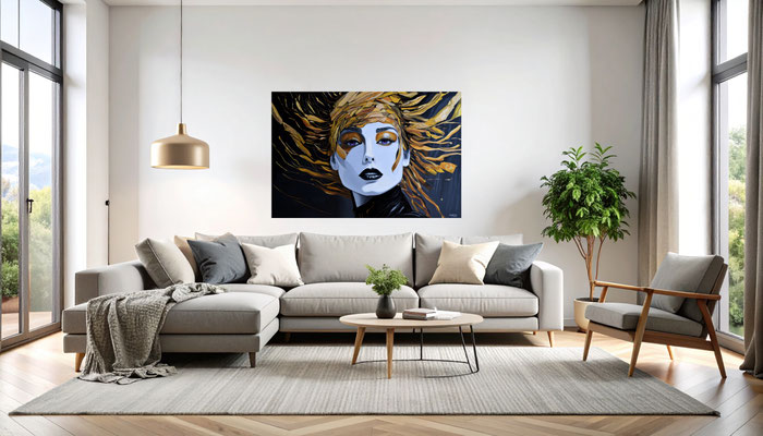 Das Gemälde vereint zeitgenössische Acrylmalerei, mythische Symbolik und starke Porträtkunst zu einem eindrucksvollen Werk, das den Betrachter unmittelbar fesselt.