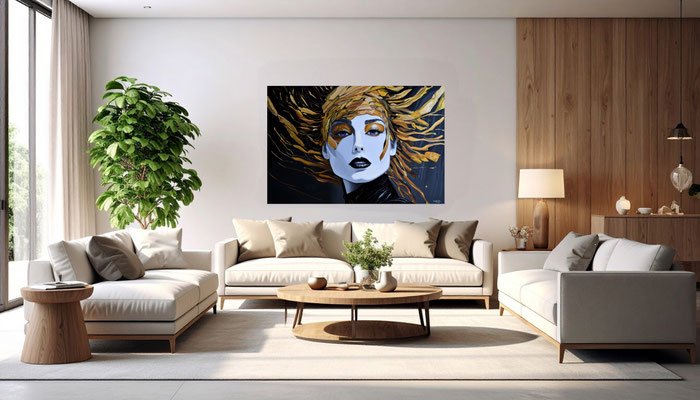 Colorful acrylic painting on canvas depicting a modern, expressive portrait of a woman in bright shades of blue, orange and purple. This unique piece combines elements of pop art with contemporary painting and immediately attracts everyone's attention with its dynamic composition and intense colors. The depiction is powerful and emotional - perfect as an eye-catching work of art for modern living spaces, galleries or art collections. Painted with acrylic paint on high-quality canvas, the artwork symbolizes strength, individuality and creative freedom - an impressive example of modern art on canvas.